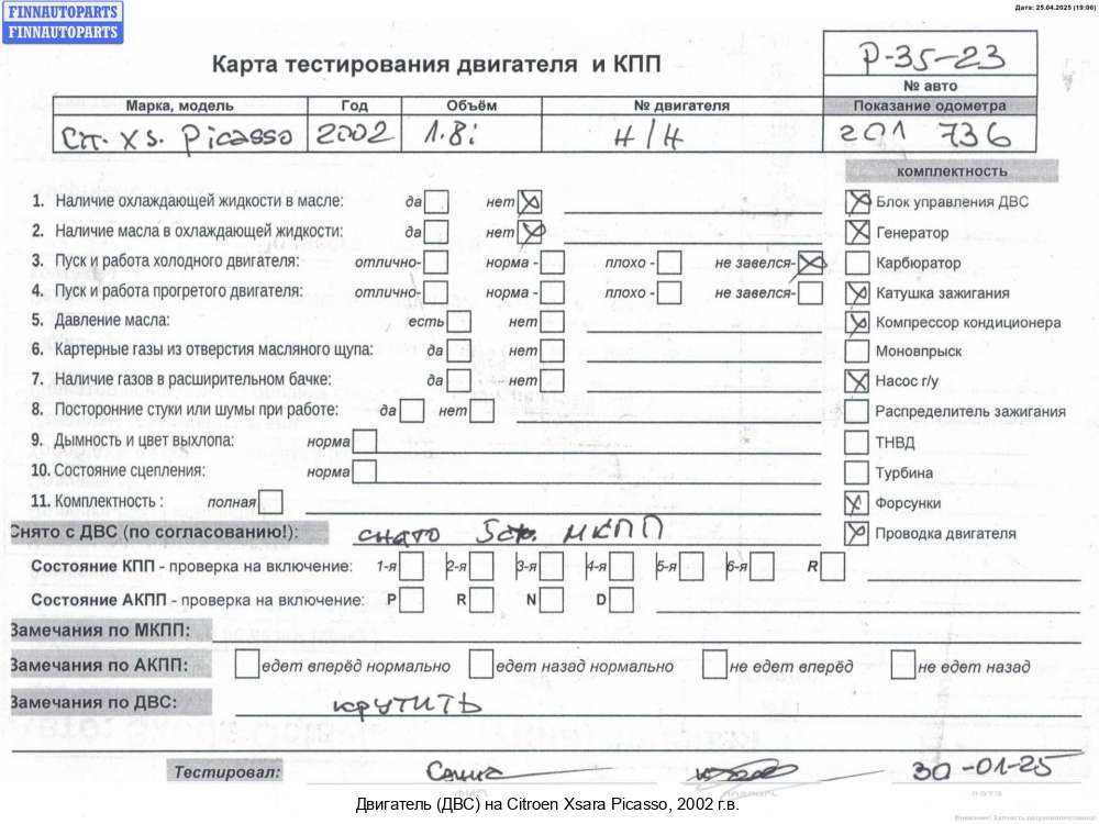 Ханты-Мансийск | 2006 | 0135HV, 2006, 1.6л, Дизель, HDI, 9HX, PSA9HX10JB660068581, 0135HV, Минивэн, бежевый, Фото не актуально, с запчасти отделены: Генератор, Турбина, Маховик, Компрессор кондиционера, Насос гидроусилителя руля (ГУР), Заслонка дроссельная, Форсунка топливная, Форсунка топливная, Коллектор выпускной, Кронштейн крепления генератора, Форсунка топливная, Патрубок интеркулера, PSA9HX10JB660068581 | - | К, прокручивается, стояние ГРМ - нормально, поддон - нормально, клапанная крышка - нормально, эмульсия - нет, 1 массовый, 1 форсунка на ДВС не достается, закисла. скол клапанной крышки, сломан отвод, бит датчик, дефект патрубка, | |||